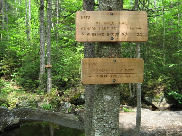 Donkey Hill Cut Off was somewhat muddy, I spotted many moose foot prints in the mud, kinda scary. (Ya I'm a bit wimpy for a treasure hunter.) Any way here the Donkey Hill Cut Off ended at the junction of Mt Kineo Trail. The trail sign on the other bank of the stream leads northward on the Mt Kineo Trail, but I'd take the southward section and back to my car at Stinson Lake road. | |