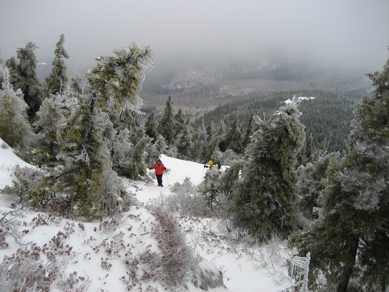The group making our way up. Snow was much deeper after the first open ledge, showshoes may be helpful but we managed without. Trail finding became increasing hard due to both the lack of trail markings and snowdrift obscuring the trail. | |