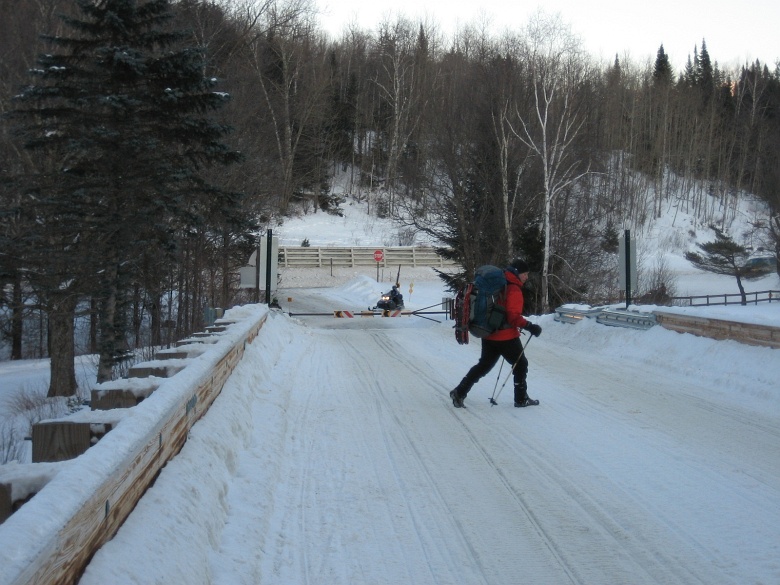 There were pretty heavy snowmobile activity along the road. Would be a shame to survive the frigid cold on the mountain only to be killed by snowmobile on a road walk. Kim was trying to get out of the way of the snowmobiles which were coming on all directions. |