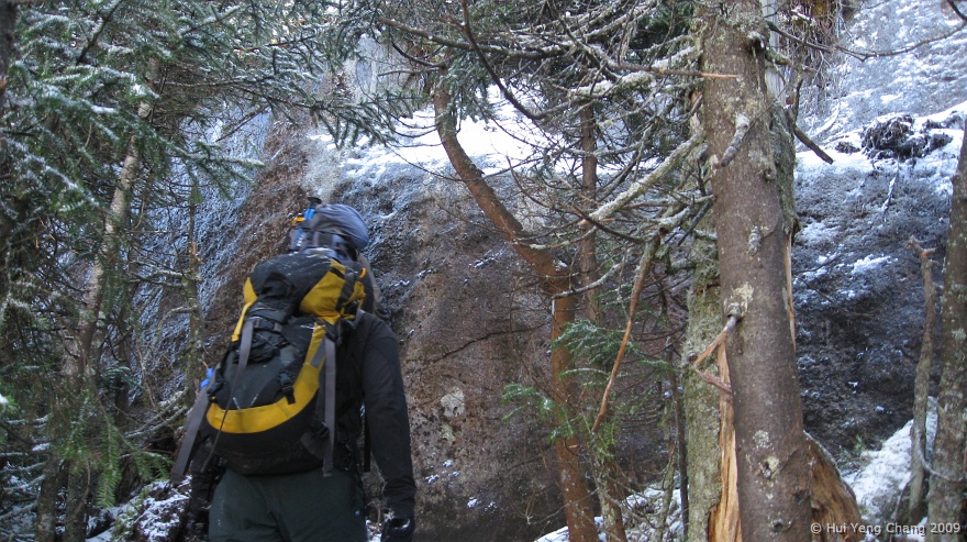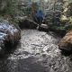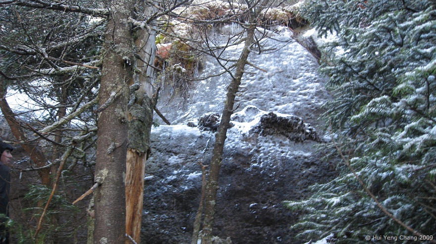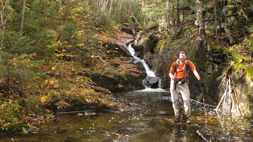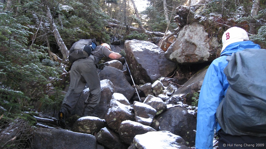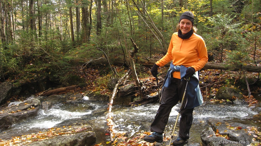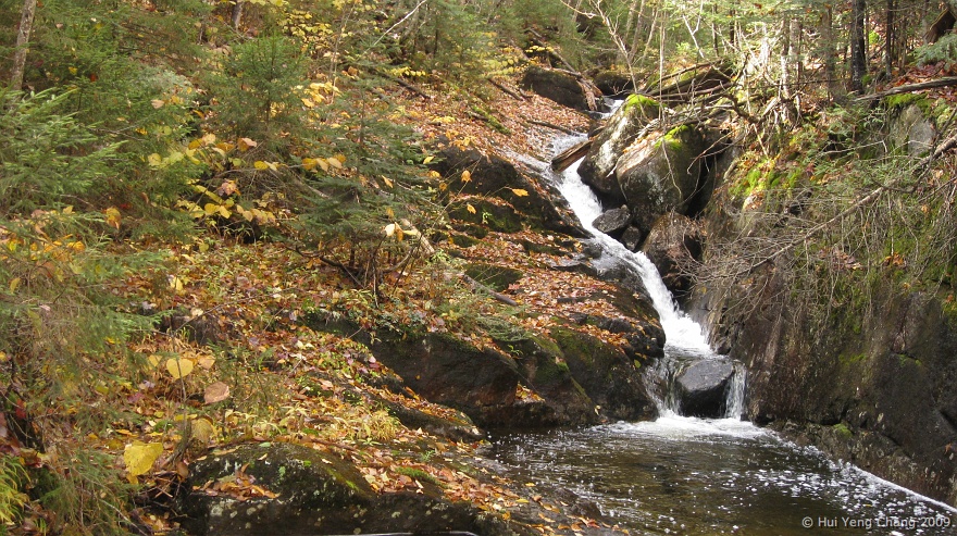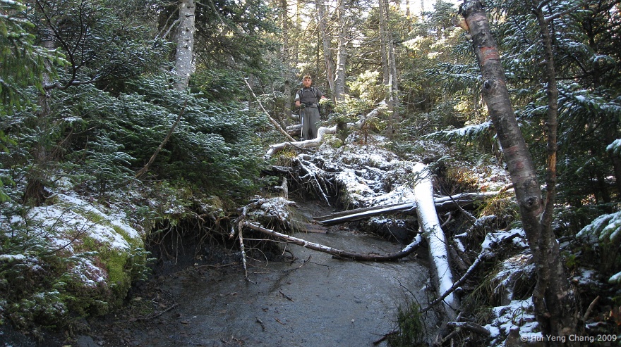 The begining of the trail runs along a brook and it was quite beautiful, but once the trail left the brook, it becomes steeper and we encountered our first sight of snow and ice of the season. My shoes were pretty soaked by the time we got to the summit of Seward. A quick hi and bye to the wooded summit, we made our way to Donaldson. While taking a lunch break at Donladson and enjoying the nice view the summit offers, I began to feel that my core was getting cold, and the wet feet just added to another factor for me to decide not to go to Emmons, the last and viewless summit on the range. Kim joined me in the decision and we came down via Calkins Brook trail, added few more miles to the hike, but it was well worth it.
