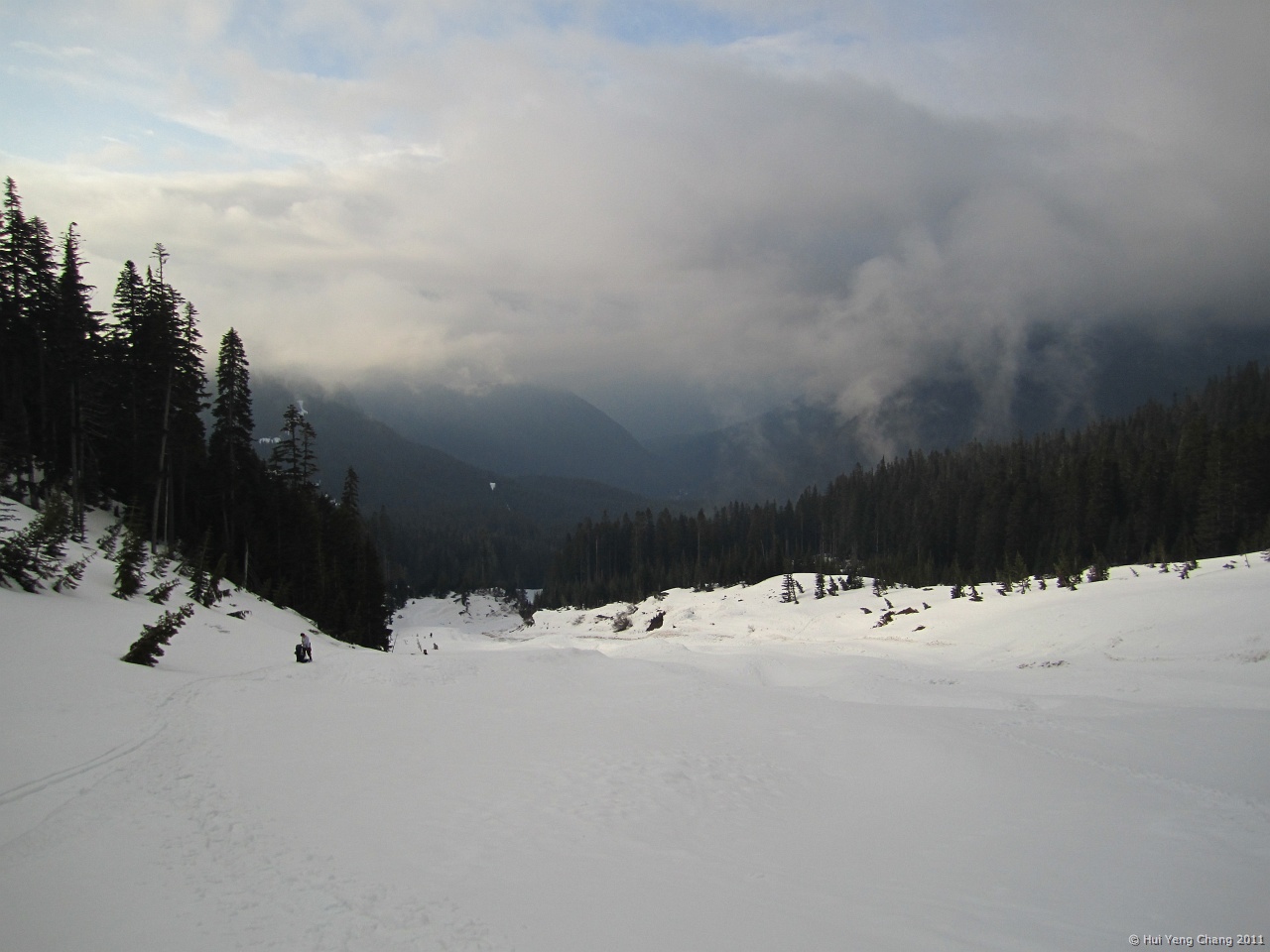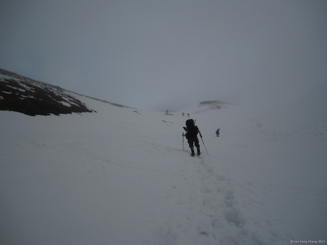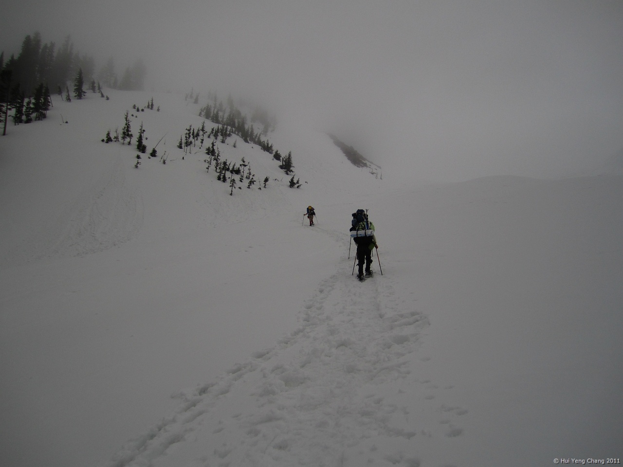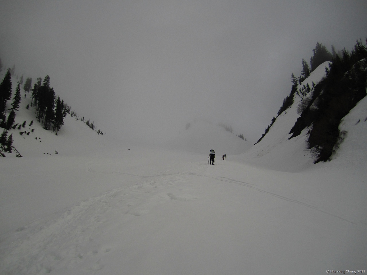 We hit the trail around 5 PM, by the time we got to a possible site to call it a day, it was about 8 PM. It was heavily fogged in, we did all the camp chores in the mist, it was pretty cool.