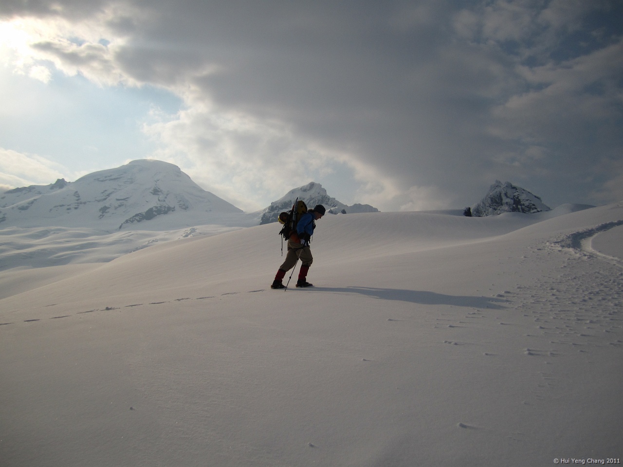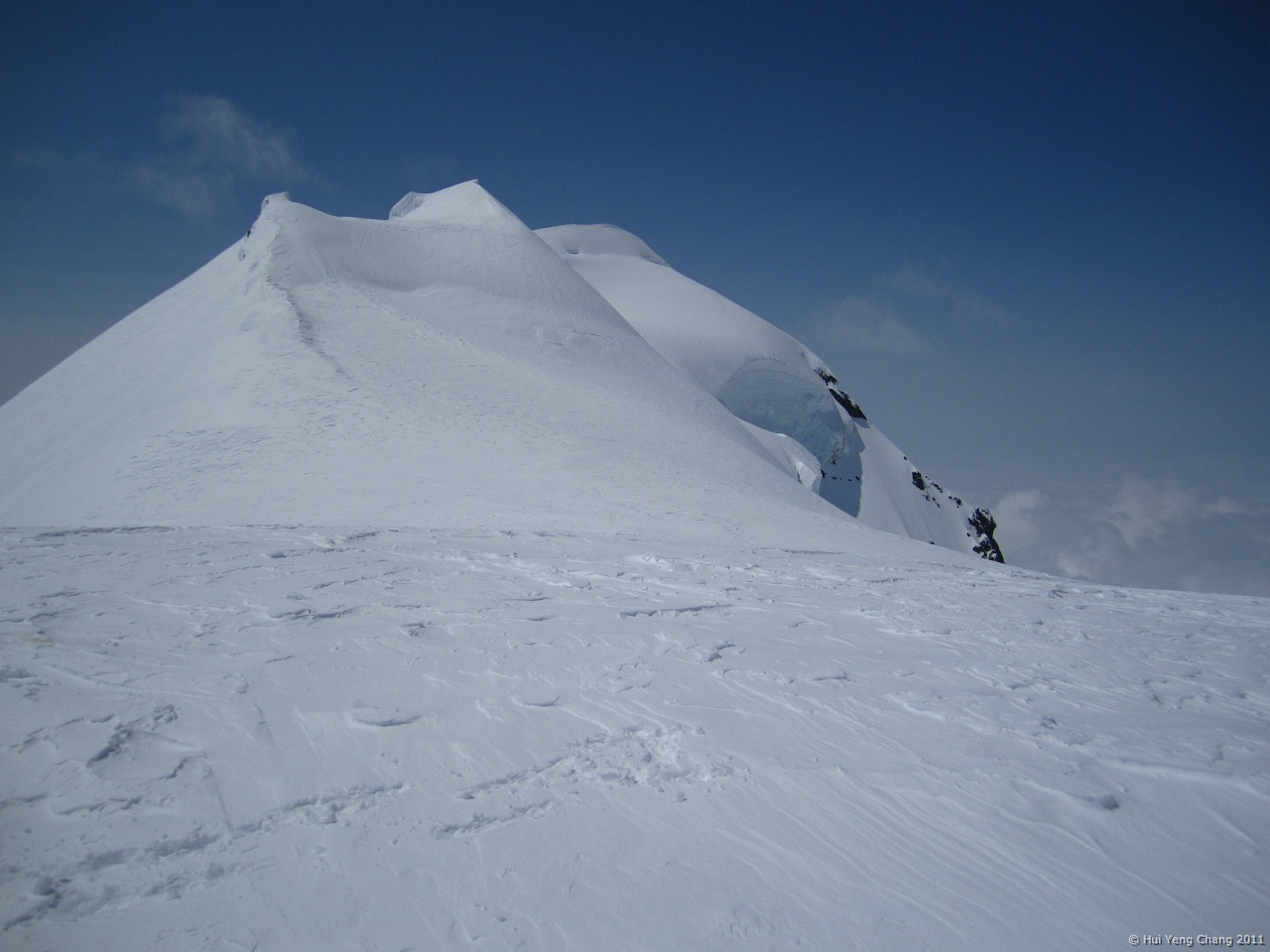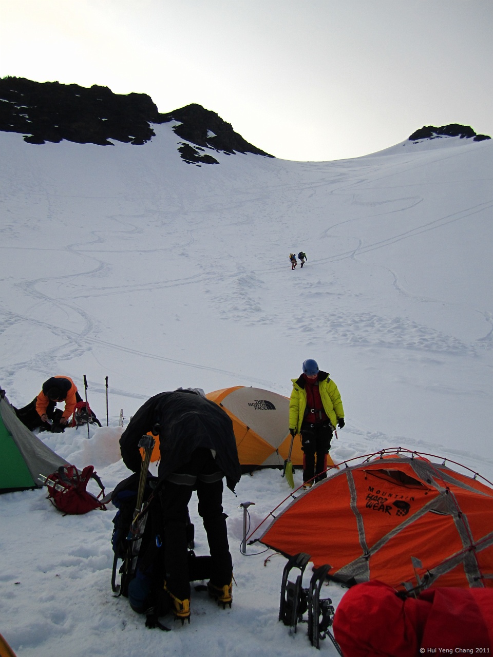 Anyway, so all four of us made it to the summit together, and Lei arrived shortly after! The climb back to the camp was a morale bashing, spirit crushing experience. We're clouded in as soon as we climbed below the saddle, with almost whiteout conditions and freaking postholing on every step we took, we slogged and cursed our way back to the camp around 8 PM. Thanks to Kim, who had been busy melting snow for us, we had plenty of water to rehydrate.