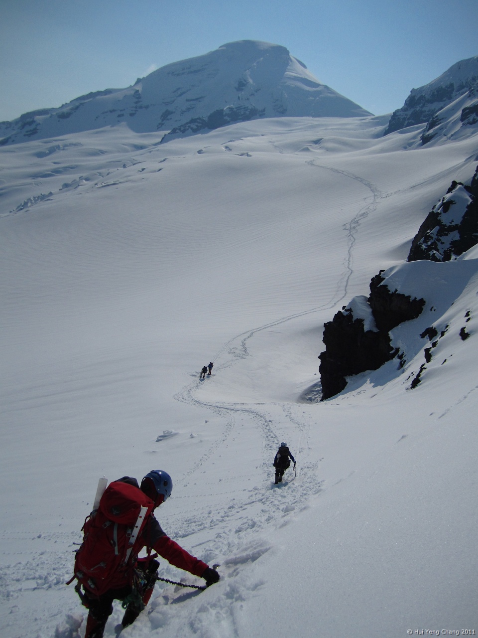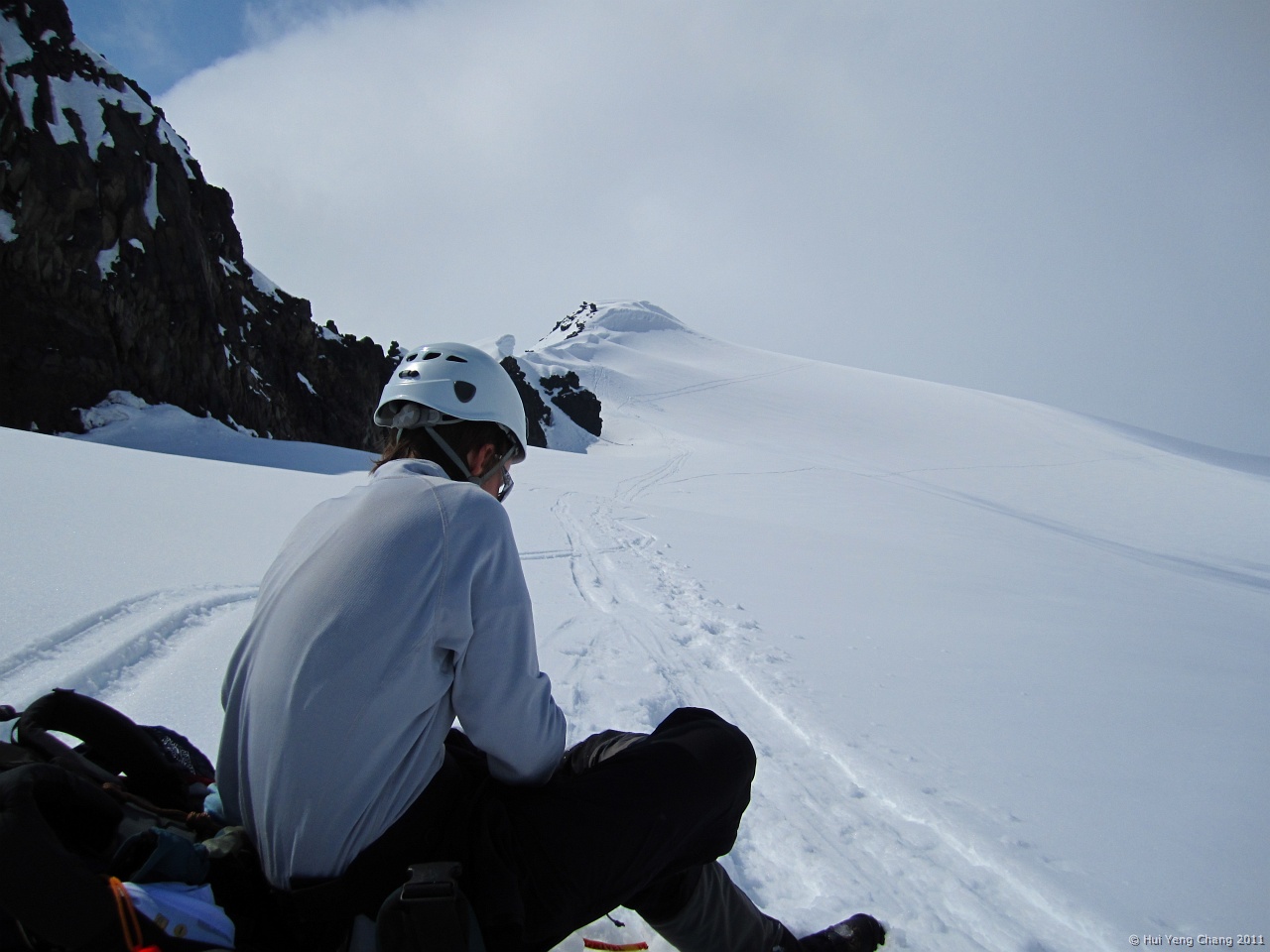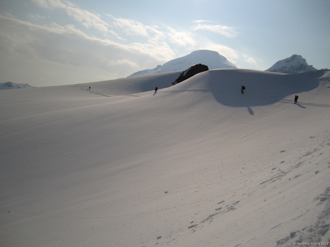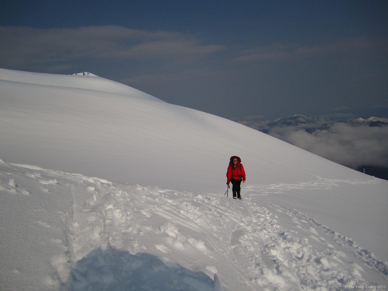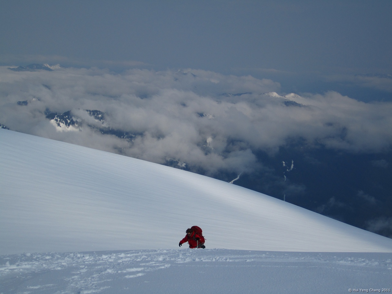 After a quick break, we headed up the last big snow cone before the summit. I fell behind Rob, Jen and Jeff when I stopped to deal with my glacier glasses. The sun was behind us at this point, and the rays sneaked in through the tiny gap between my right temple and the glasses, I was began to see spots. Fearing that I may develop snow blindness if I didn't take care of it, I stopped to double up my glasses with my goggle to ensure a better protection. It sure felt much better after the adjustment, I could open my eyes again. By now, I had fell far behind the faster trio. They were doing all the hard work of kicking steps up the snowfield.