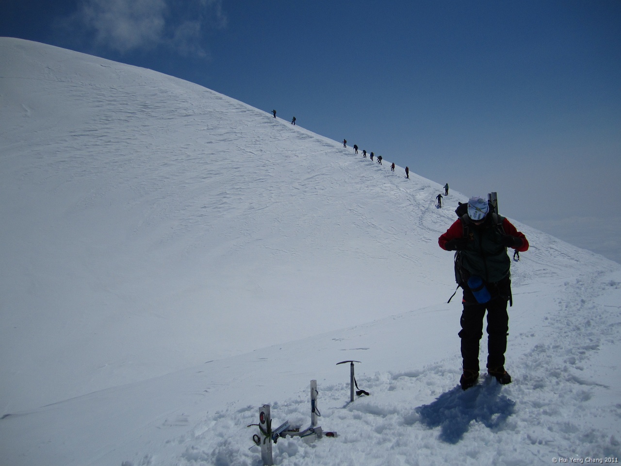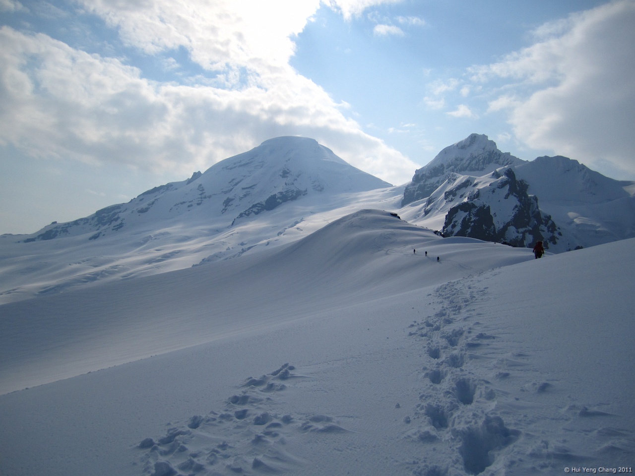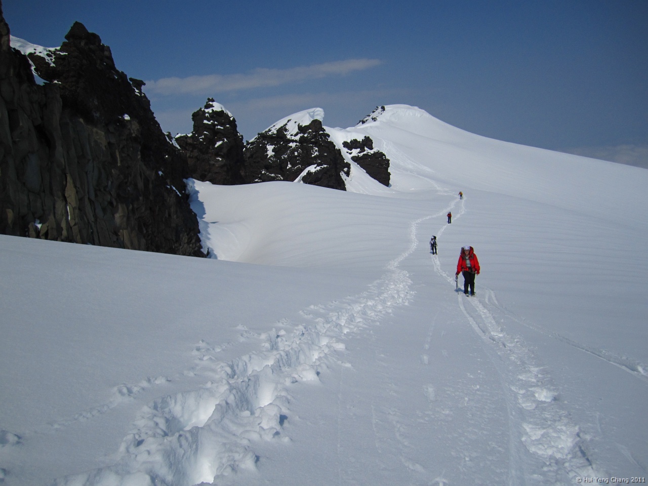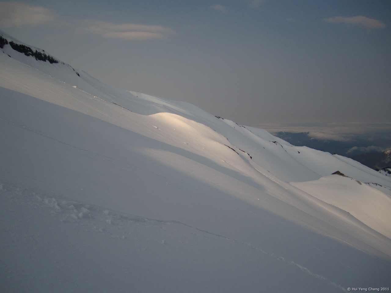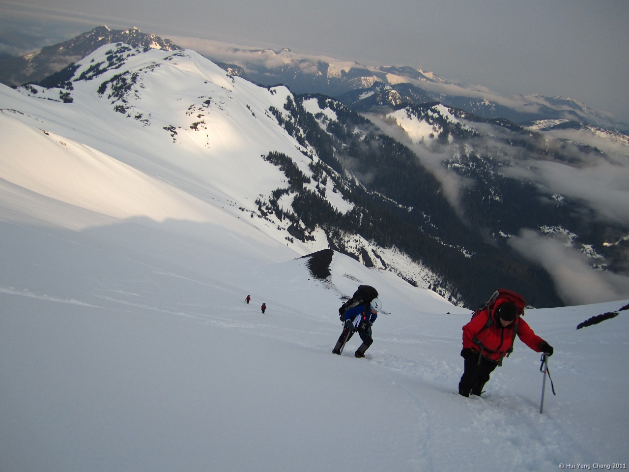 After a quick break, we headed up the last big snow cone before the summit. I fell behind Rob, Jen and Jeff when I stopped to deal with my glacier glasses. The sun was behind us at this point, and the rays sneaked in through the tiny gap between my right temple and the glasses, I was began to see spots. Fearing that I may develop snow blindness if I didn't take care of it, I stopped to double up my glasses with my goggle to ensure a better protection. It sure felt much better after the adjustment, I could open my eyes again. By now, I had fell far behind the faster trio. They were doing all the hard work of kicking steps up the snowfield.