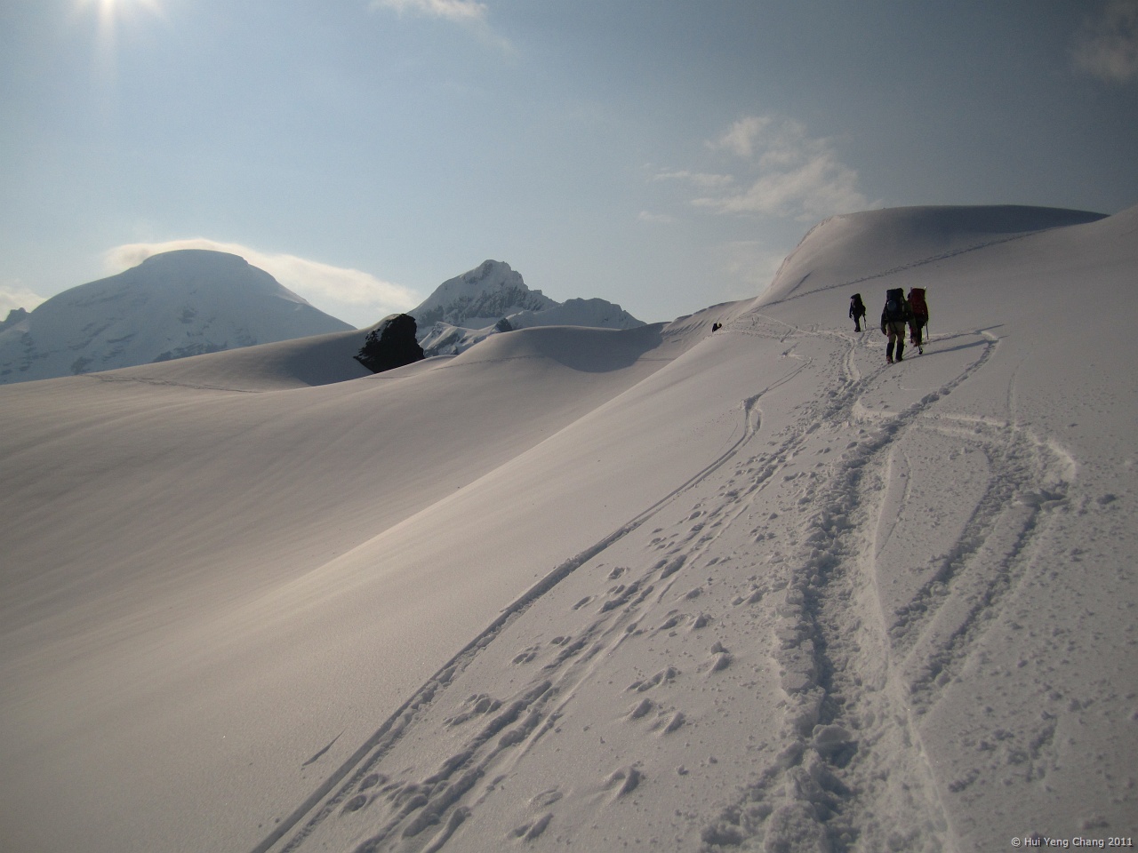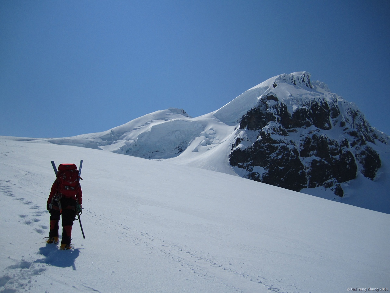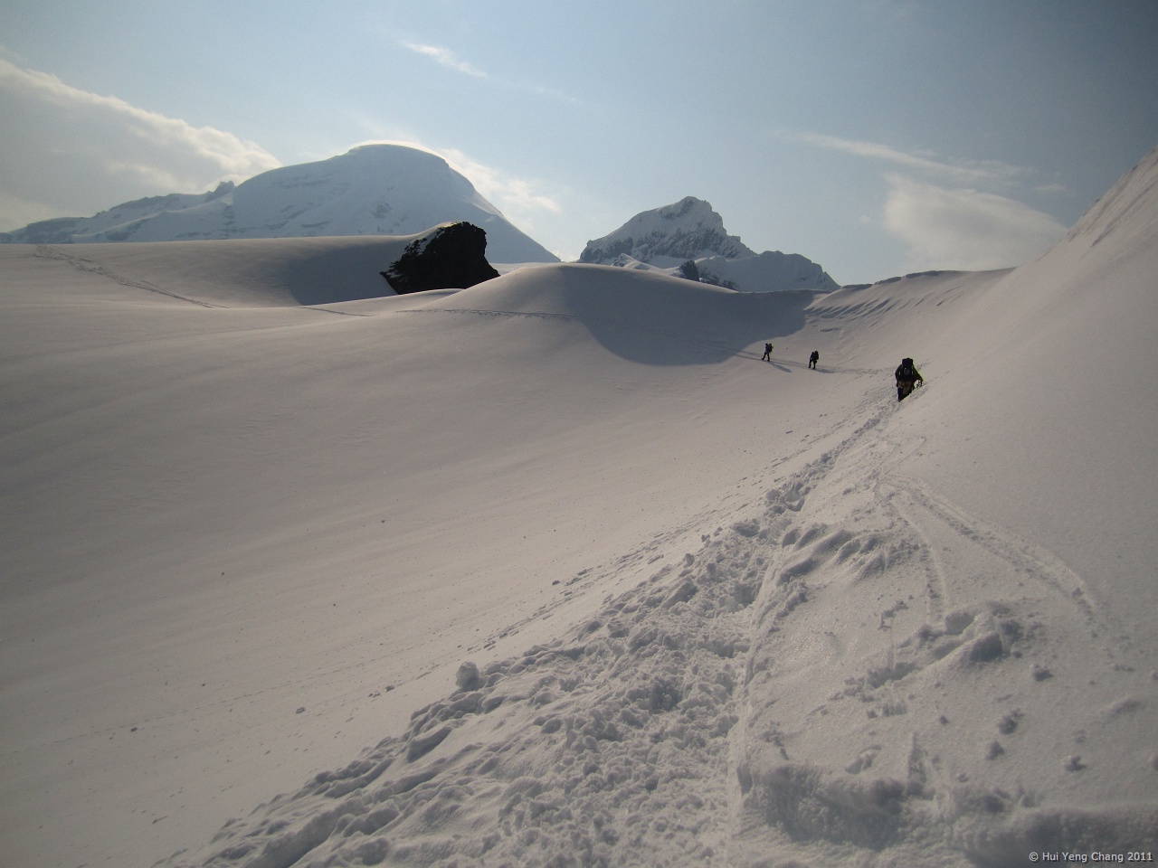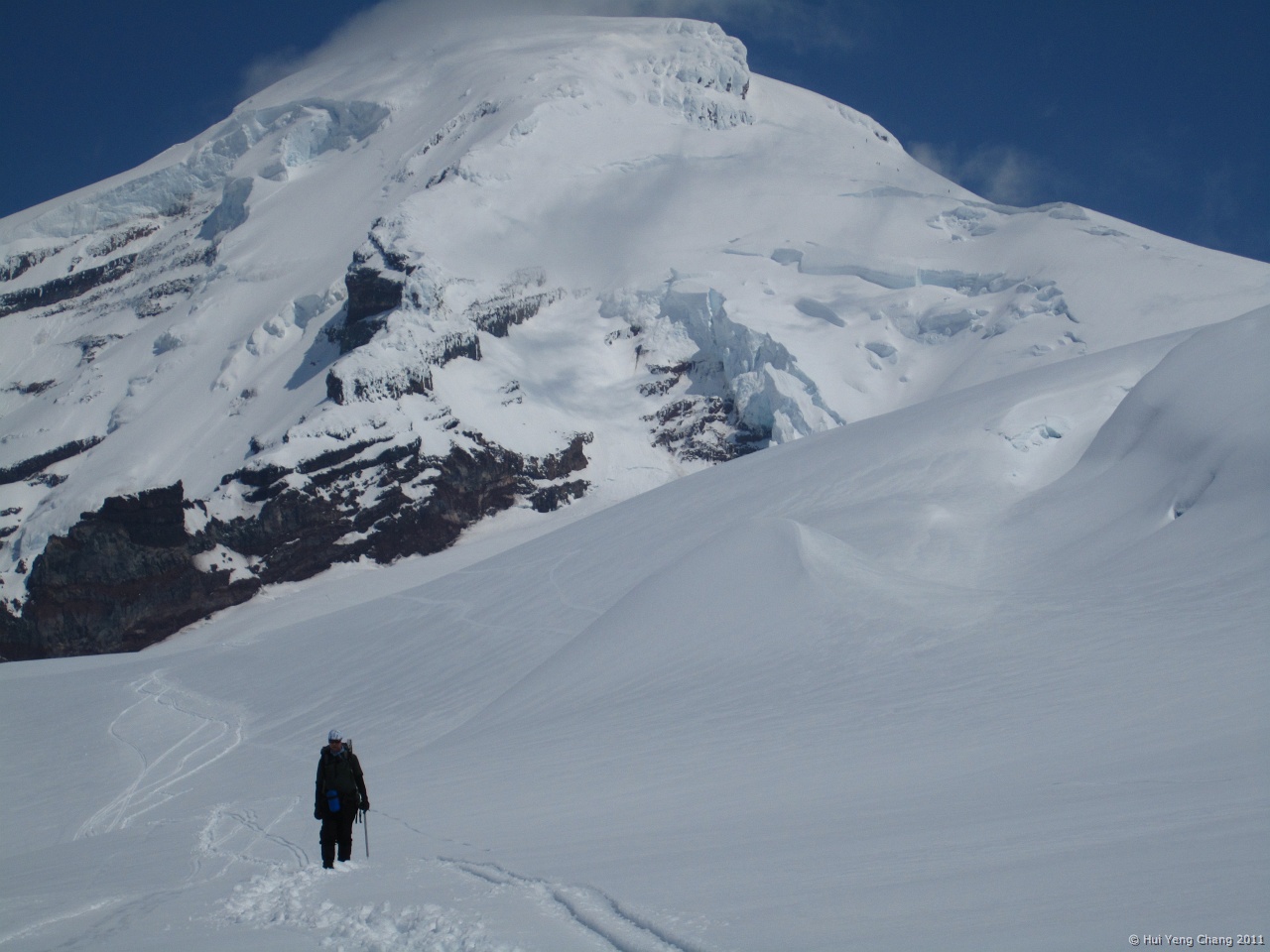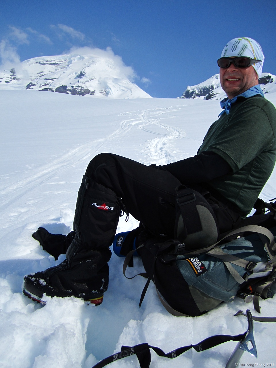 After a quick break, we headed up the last big snow cone before the summit. I fell behind Rob, Jen and Jeff when I stopped to deal with my glacier glasses. The sun was behind us at this point, and the rays sneaked in through the tiny gap between my right temple and the glasses, I was began to see spots. Fearing that I may develop snow blindness if I didn't take care of it, I stopped to double up my glasses with my goggle to ensure a better protection. It sure felt much better after the adjustment, I could open my eyes again. By now, I had fell far behind the faster trio. They were doing all the hard work of kicking steps up the snowfield.