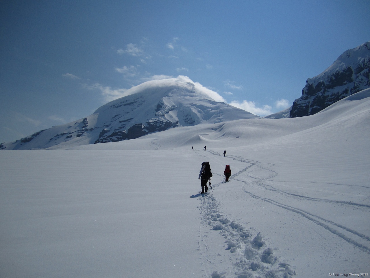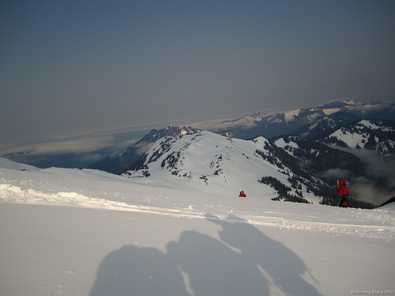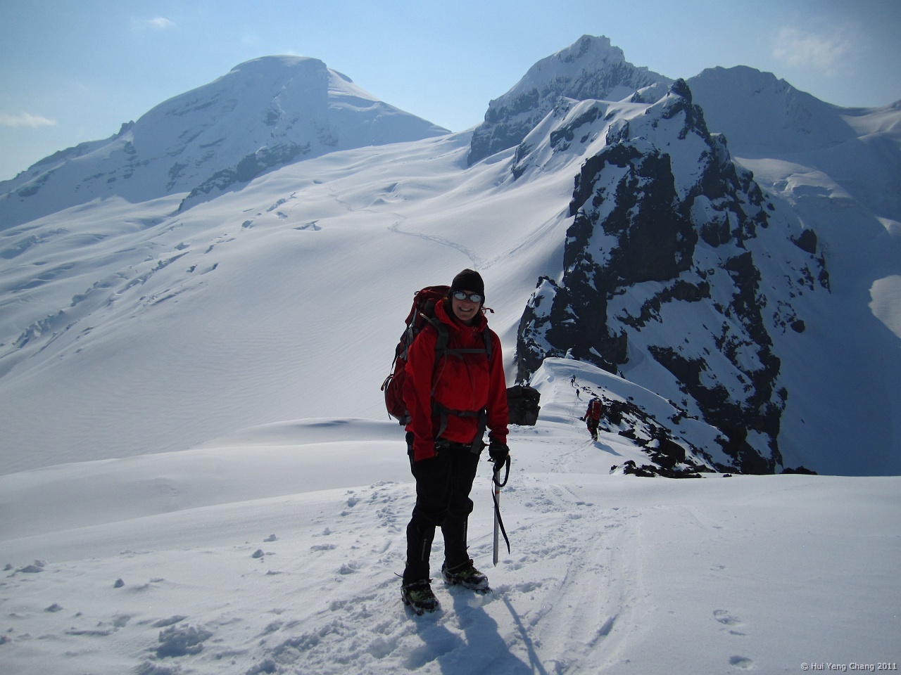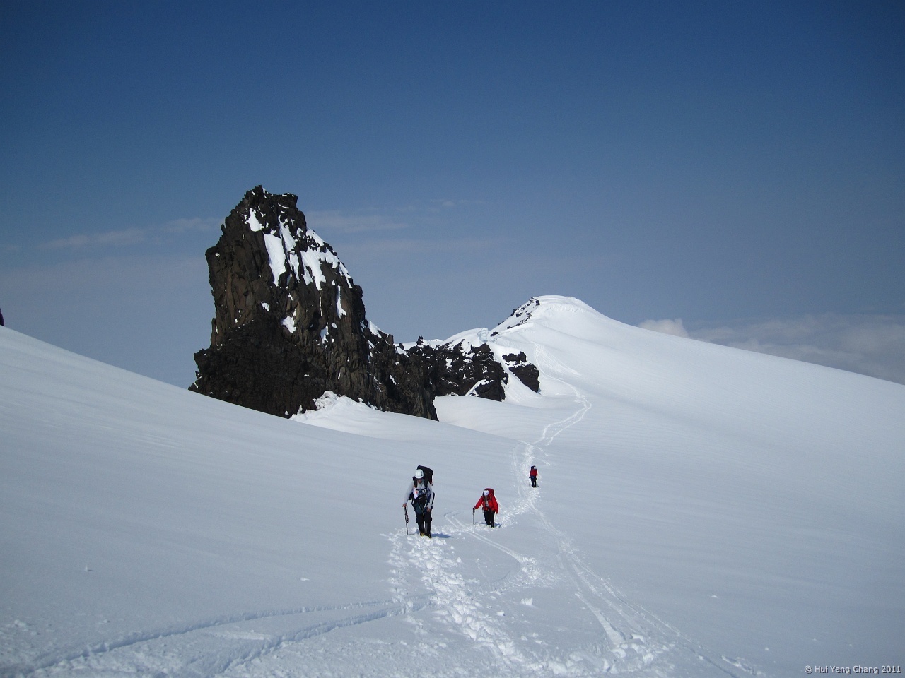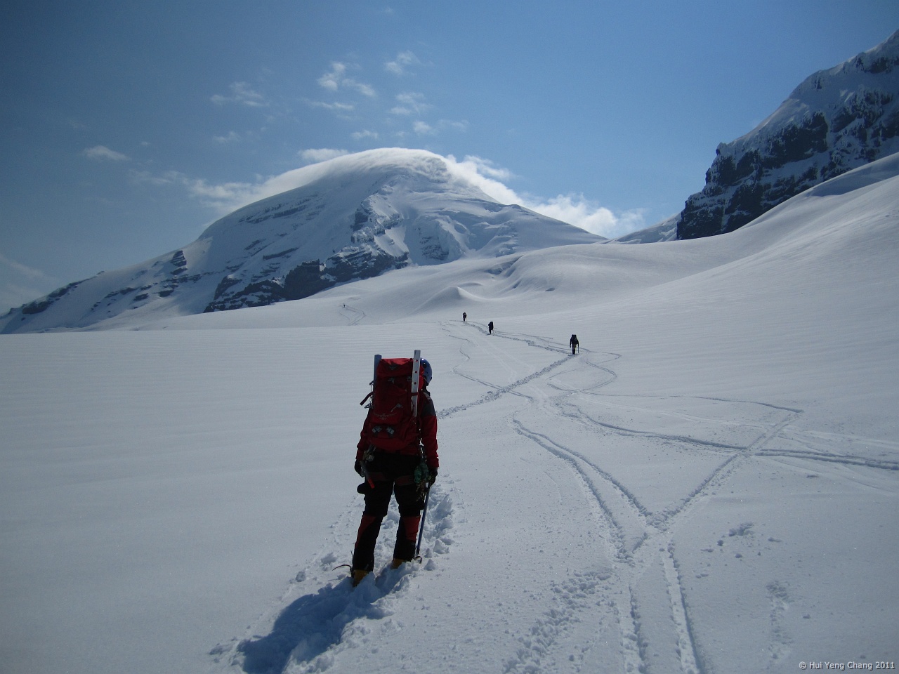 After a quick break, we headed up the last big snow cone before the summit. I fell behind Rob, Jen and Jeff when I stopped to deal with my glacier glasses. The sun was behind us at this point, and the rays sneaked in through the tiny gap between my right temple and the glasses, I was began to see spots. Fearing that I may develop snow blindness if I didn't take care of it, I stopped to double up my glasses with my goggle to ensure a better protection. It sure felt much better after the adjustment, I could open my eyes again. By now, I had fell far behind the faster trio. They were doing all the hard work of kicking steps up the snowfield.