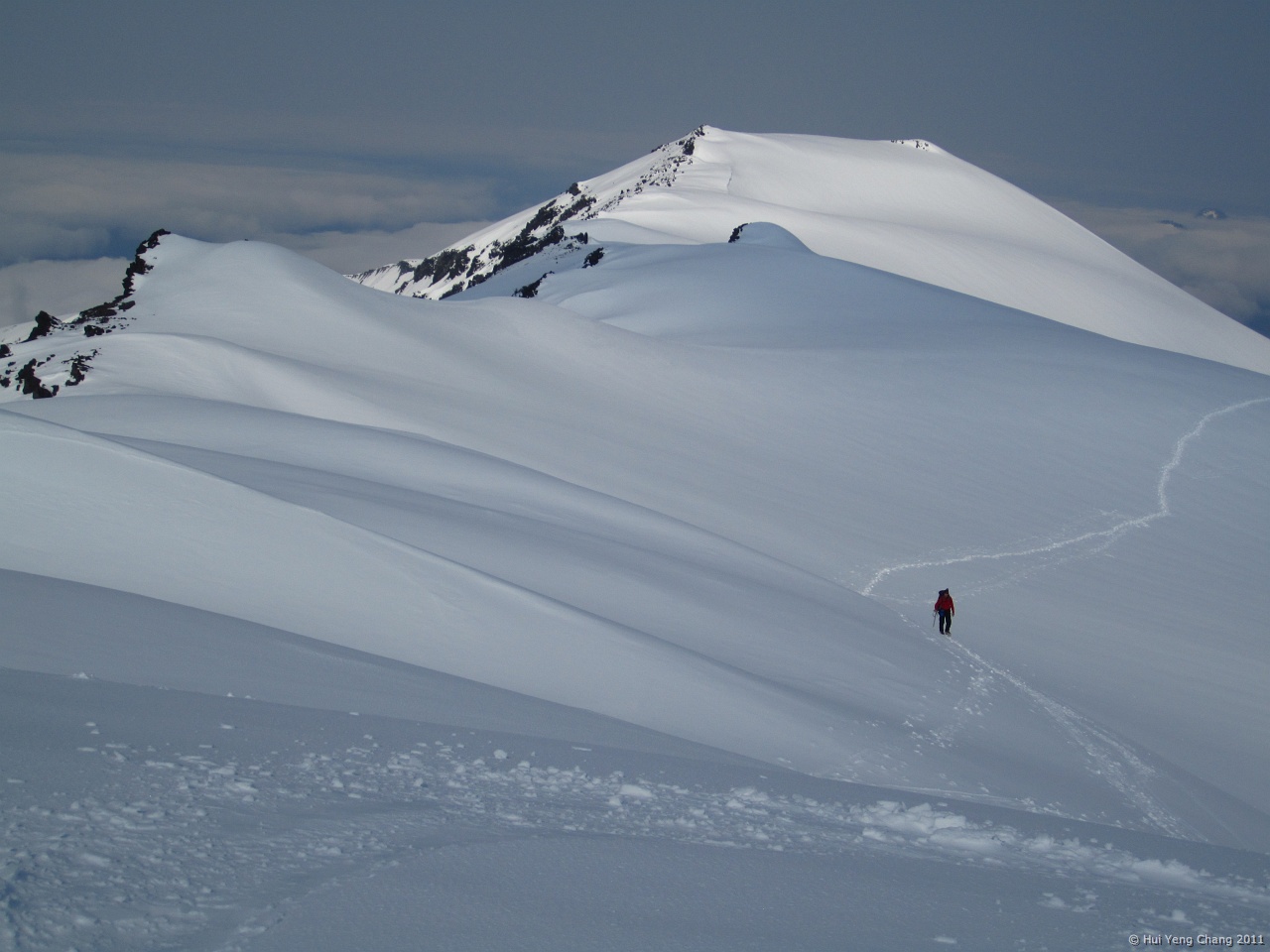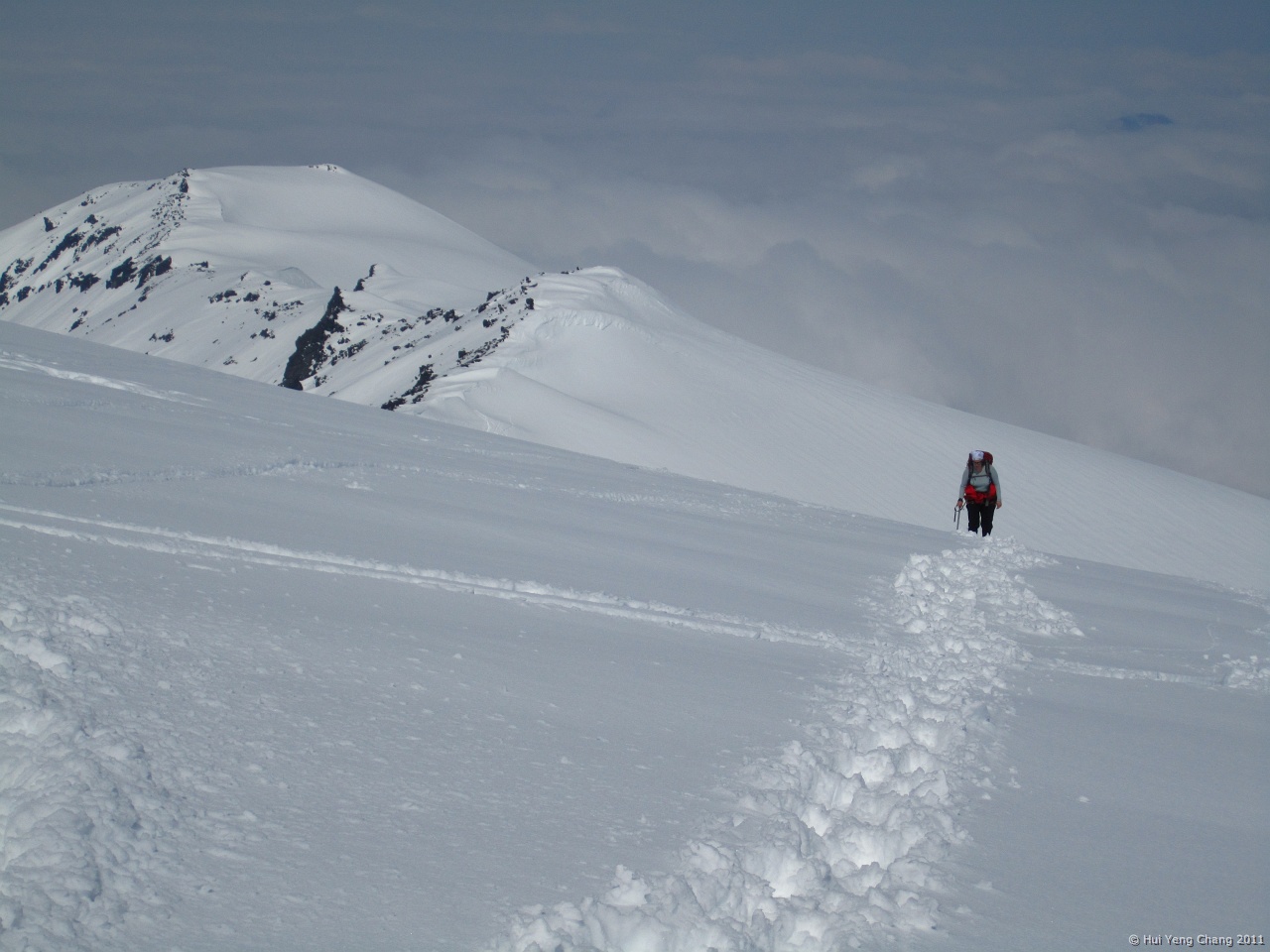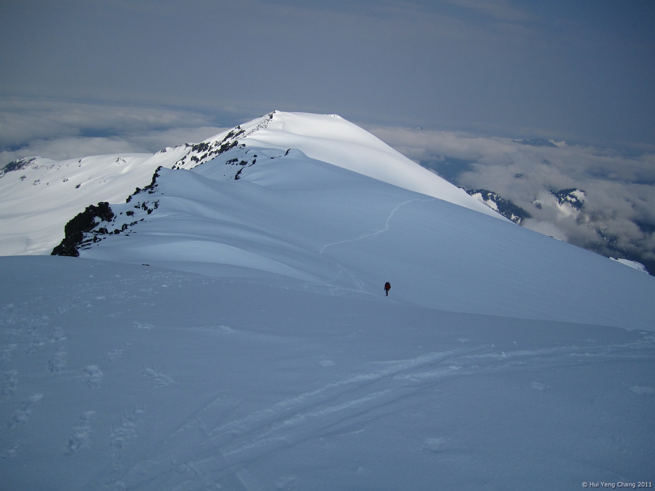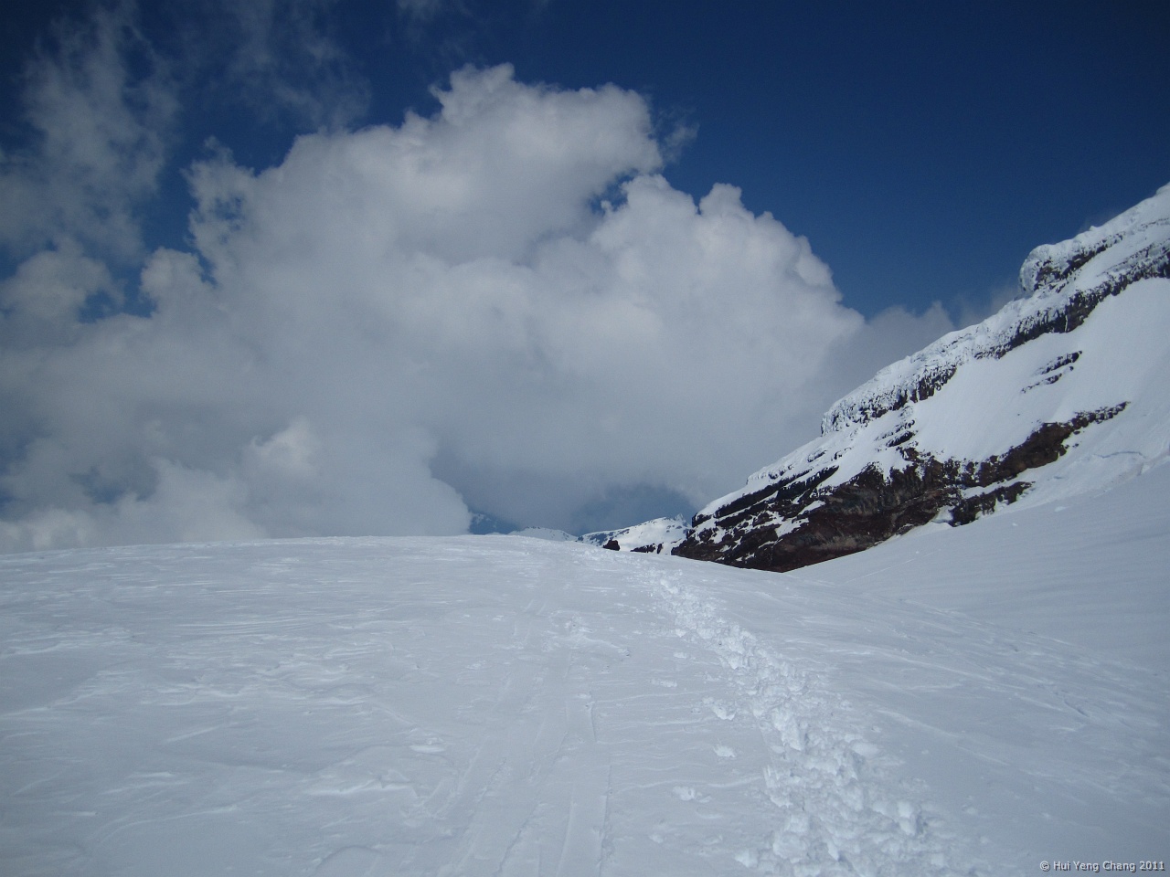 Step by step, I slowly made my way up the steepest section just below the summit crater. If the skiers didn't tell me the summit was another 20' climb away, I would have thought the snowed-in flat crater was the summit. As I was stumbling around looking for a 20' bump to climb, I saw the trio walking toward a tiny snow cone. As it turned out, when they reached the crater, it was clouded-in, they couldn't see anything taller and thought they're on the summit, only as the cloud cleared, then they saw the summit cone. Pretty funny. I can imagine the "D'oh!" moment.