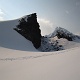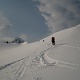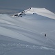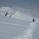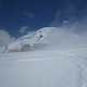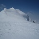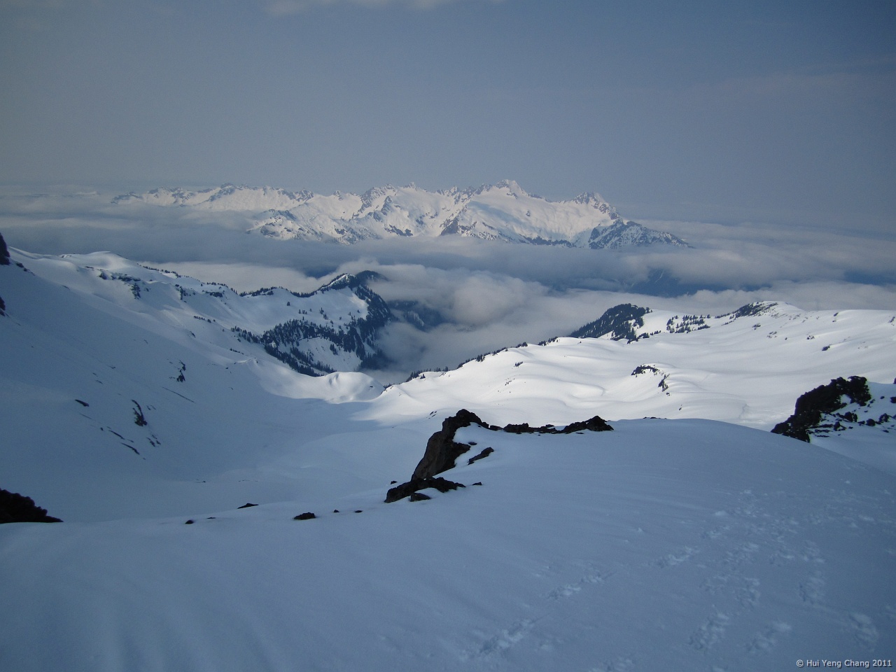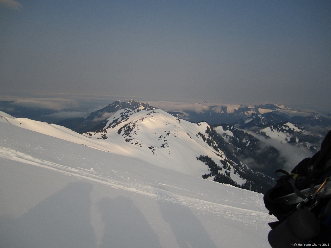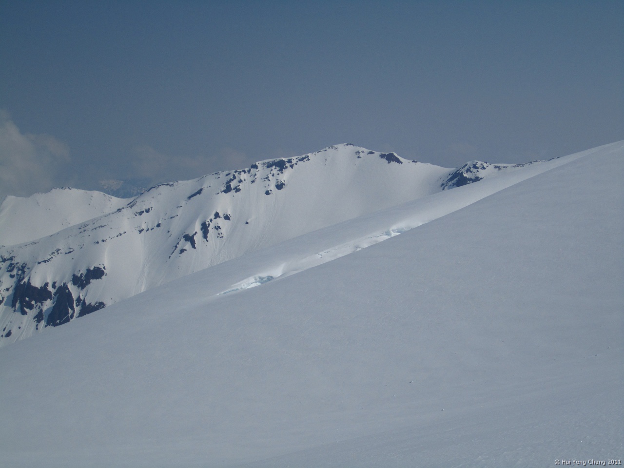 Step by step, I slowly made my way up the steepest section just below the summit crater. If the skiers didn't tell me the summit was another 20' climb away, I would have thought the snowed-in flat crater was the summit. As I was stumbling around looking for a 20' bump to climb, I saw the trio walking toward a tiny snow cone. As it turned out, when they reached the crater, it was clouded-in, they couldn't see anything taller and thought they're on the summit, only as the cloud cleared, then they saw the summit cone. Pretty funny. I can imagine the "D'oh!" moment.